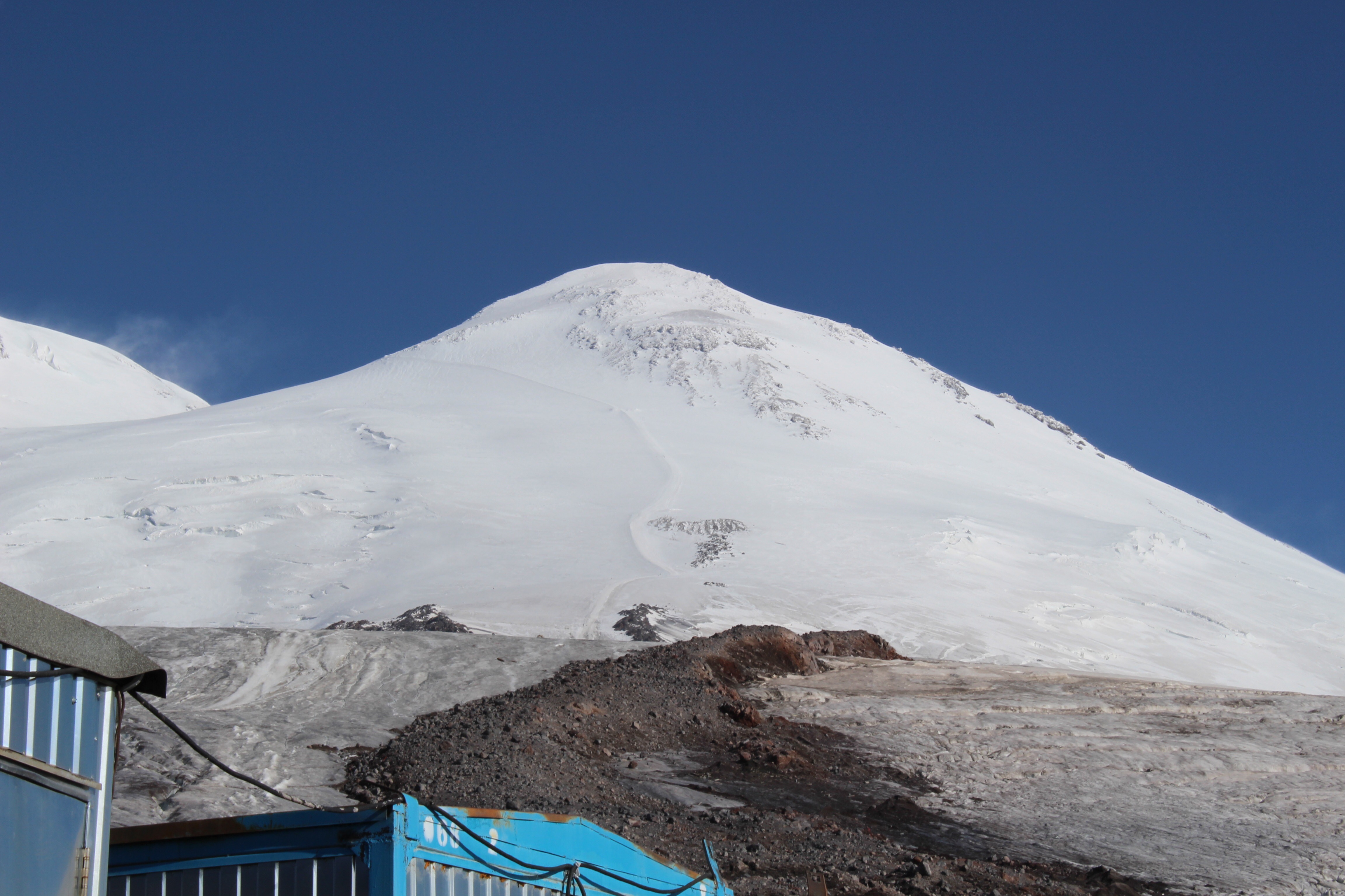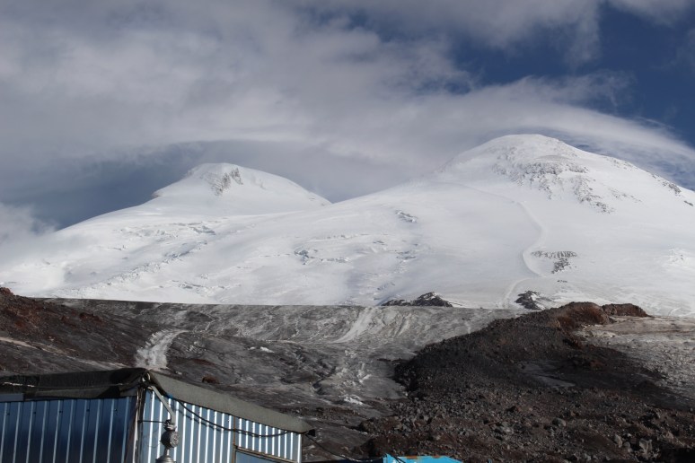 I see the twin peaks of Mt Elbrus clearly today. The path to the top is clearly visible in the snow from the constant passage of the snow cats that take skiers to the top of the ski point.