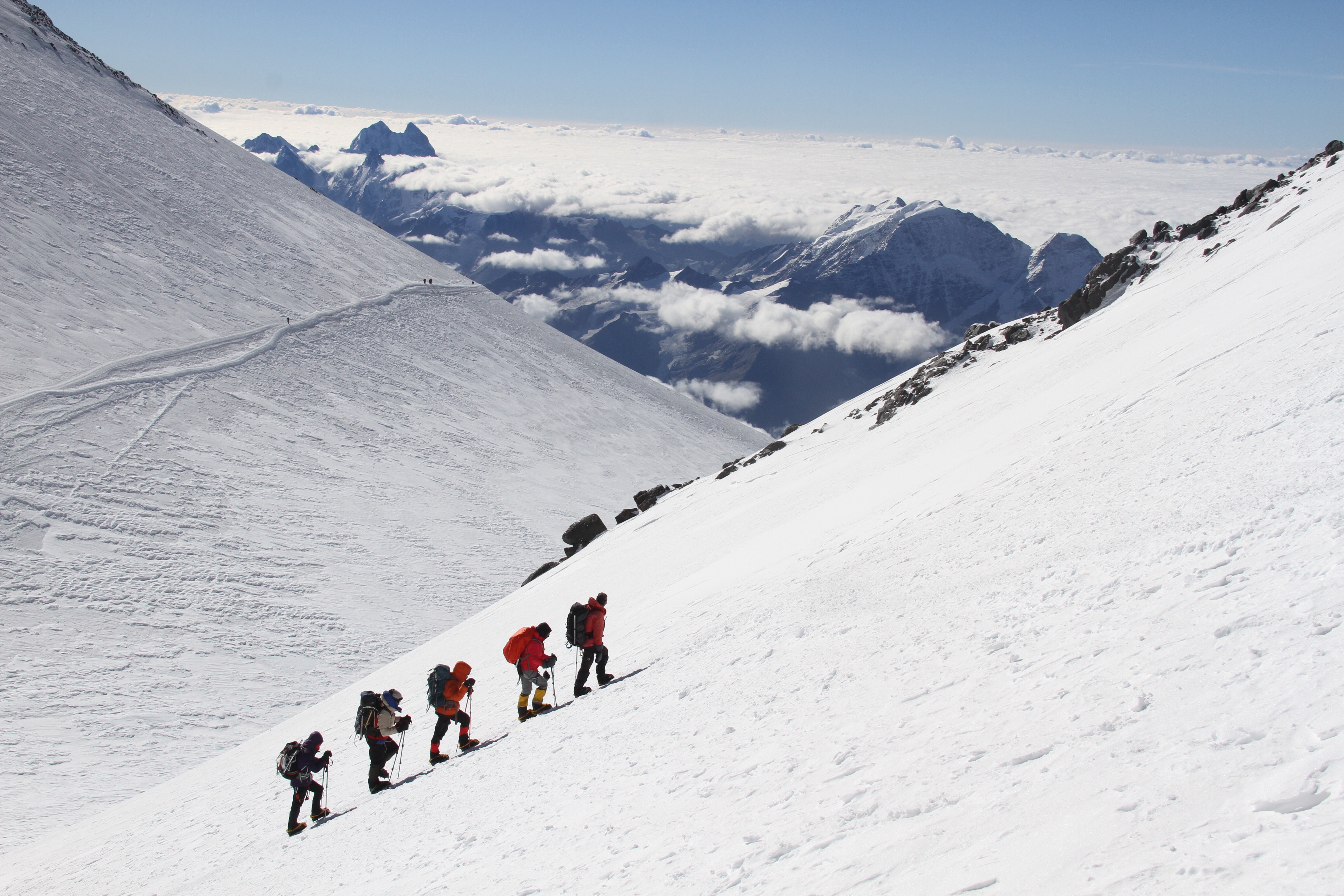 Reaching the rope section we see a guide in trouble. The guide is off the fixed ropes with his client attached to his rope dangling further down the slope. The client is offering no assistance and is essentially sliding off the mountain with the guide attached. This all happens in slow motion. The guide is anchoring his heels into the snow and ice but the pair are slowing moving lower and lower towards a drop. Heinreich resolves to go to the assistance of the guide. The 3 Amigos are roped into the Russian guide and I was attached to Heinreich. When he leaves, I hook up with the 3 Amigos and have an important role to play as I am now the last line of defence should someone fall in front of me. My mind is working overtime now that I have other lives in my hands. I am careful and shout instructions for the others to dig their ice axes in deep. We make it to the traverse point and the pressure eases on the team.