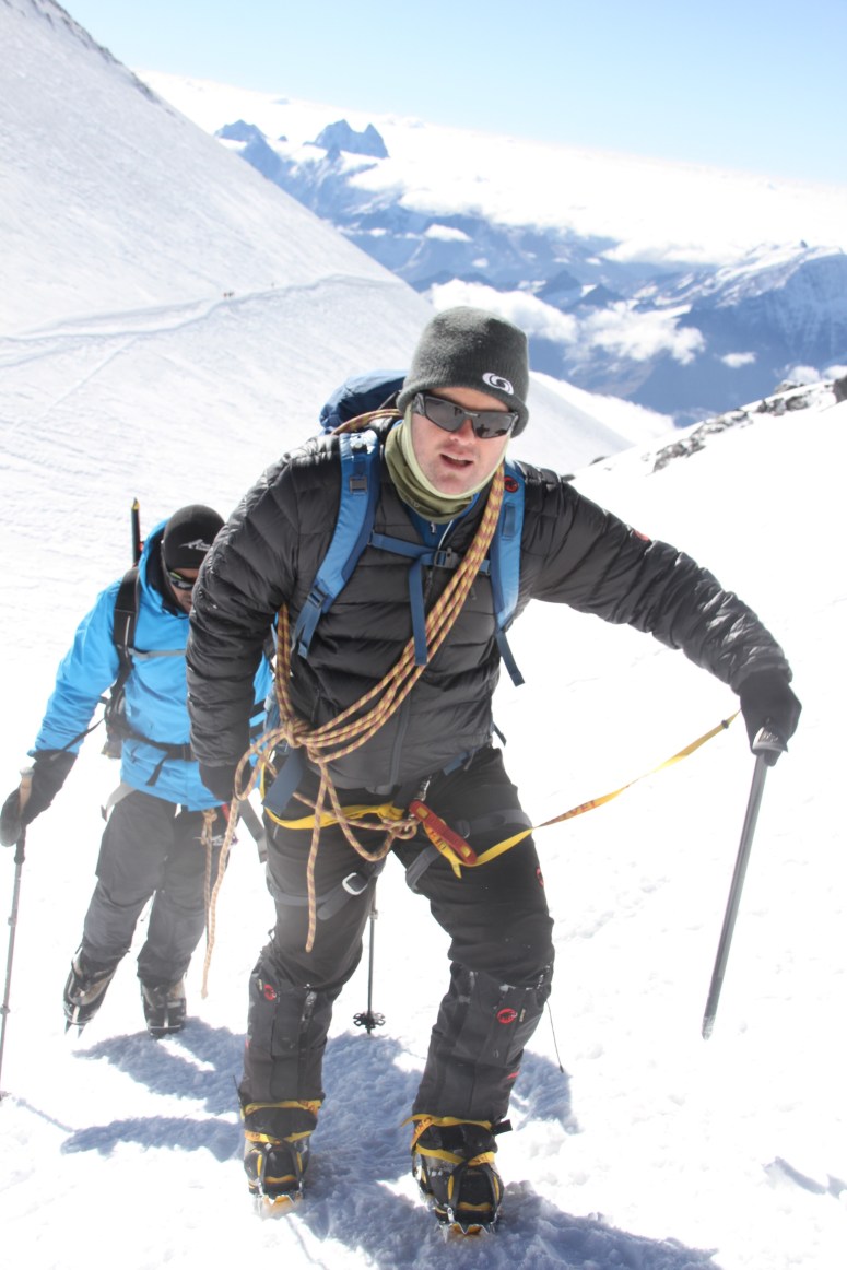 We make better progress. I am getting my second wind and feel strong. Half way up the slope, the guides have put up fixed rope to assist novices with the lateral traverse as we swing across the slope to the other side. The going is slow as the novices have not had any training on ropes and are stuck. Heinreich asked if I am good to go unhooked i.e. bypass the rope on the top side. I agree and we set off. The snow is deep and as per our training, I ensure that I have at least 2 points of contact at all times on the mountain making use of the ice axe whenever a foot is lifted. It is monotonous but it’s the practice that will keep you alive in case you slip.
