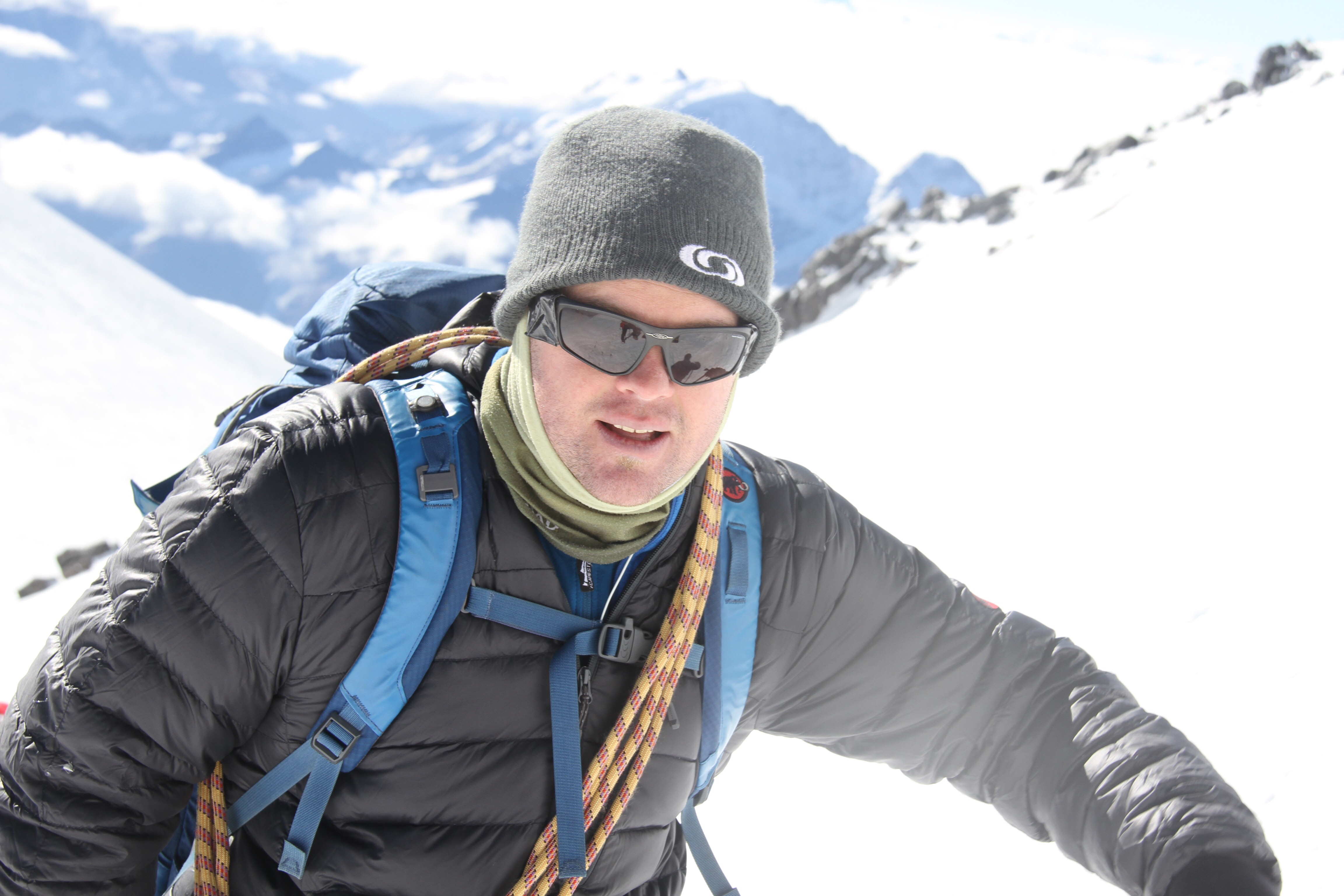 We are now on the 2nd mountain which goes straight up at a 50 degree angle. This is the tipping point for snow as it accumulates. I am theadered to Heinreich with a rope and we start our way up the slope. We cannot climb the 50 degree angle with a direct angle of attack and have to use the switch back routine to summit i.e. walk at a shallow angle to the mountain and switch and go the other way. It takes longer but is a lot more efficient on the legs and ankles.